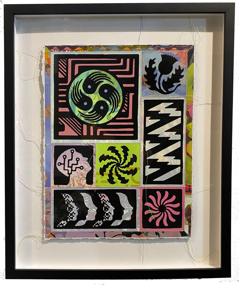 Screen print, thread, mixed media
